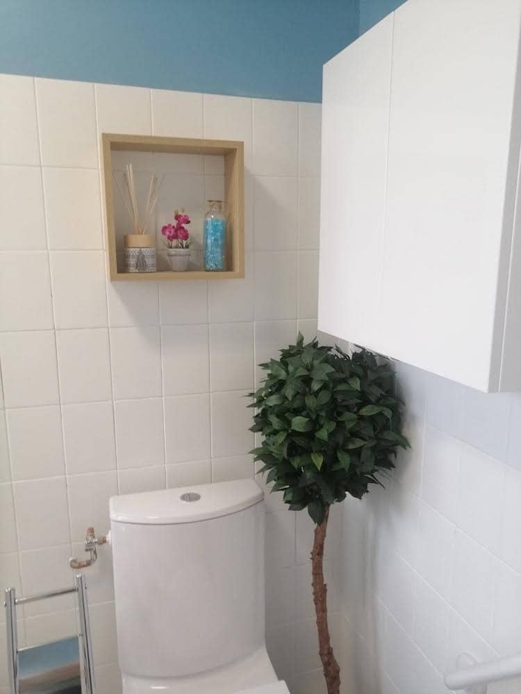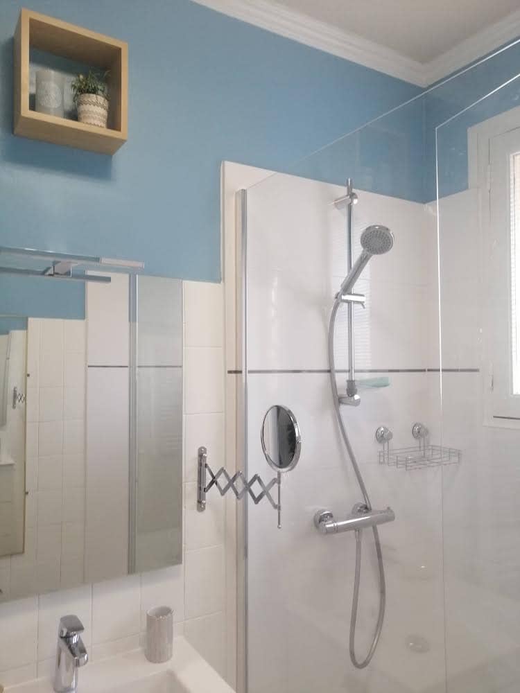 Notre chère petite cliente septuagénaire pleine d’énergie a profité du remplacement de sa baignoire par une douche pour relooker sa salle de bain. Elle tenait beaucoup au bleu qu’elle avait déjà mais le voulait plus clair. C’est cette teinte qui a retenu son attention. Elle est ravie du résultat et est fière de recevoir de nombreux compliments sur cette pièce.