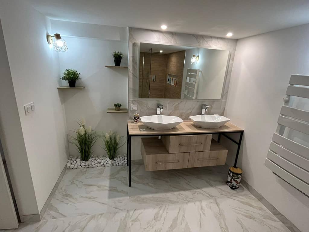 J’ai donc dessiné cette salle de bain à l’ambiance spa très claire pour renvoyer la lumière artificielle et j’ai imaginé cette incrustation de végétaux, dans ce recoin qui les gênait, pour donner l’impression d’une vue sur l’extérieur.
